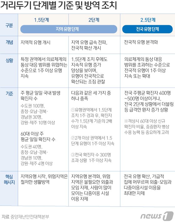 (수정됨) 뭐 현재는 계속 상황이 바뀌니까...이정도면 될려나 했더니 더 세분화 해야할거 같으면 세분화 해가면서 현상 자체에 대응할수밖에 없을거란 생각은 드네요...보통 2단계에 준하는 2단계보단 강화된 이런식의 지방에선 정책들이 나오다보니 거기에 맞춰서...새로 만드는거고...그만큼 2.5단계나 3단계는 부담이 크다는거겠죠...이 2.5단계도 지방들의 단계 중간으로 자꾸 만드니까 그걸 나름 기준화한거일텐데...