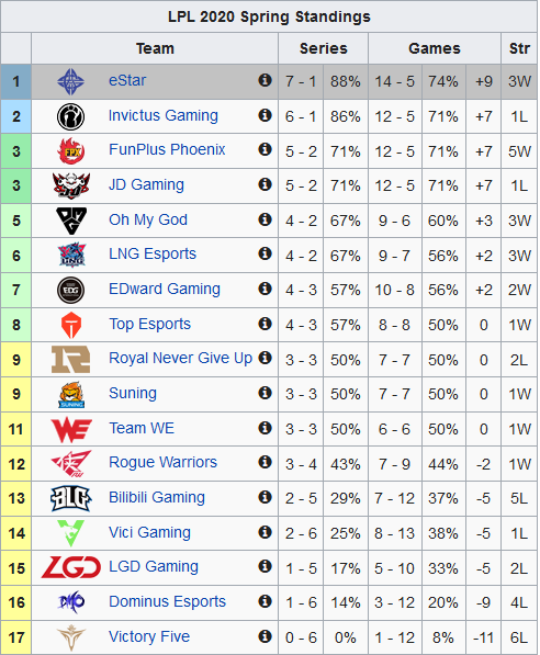 2위. IG - 6승 1패 +7 3위. FPX, JDG - 5승 2패 +7 5위. OMG - 4숭 2패 +3 6위. LNG - 4승 2패 +2 7위. EDG - 4승 3패 +3 8위. WE - 4승 3패 +1 9위. TES - 4승 3패 0 10위. RNG, SN - 3승 3패 0 12위. RW - 3승 5패 -3 13위. BLG - 2승 5패 -5 14위. VG - 2승 6패 -5 15위. LGD - 1승 5패 -5 16위. DMO - 1승 6패 -9 17위. V5 - 0승 6패 -11