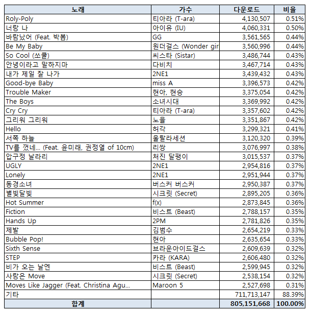 참고로 U愛나에 올라온 가온차트 분석 자료중 다운로드 TOP 30입니다. 홍승식님께서 작성 하셨고 집계기간은 2011년 2월 27일부터 20112년 2월 11일까지 총 50주입니다. http://cfile266.uf.daum.net/original/162219394F40E2C108F4F5