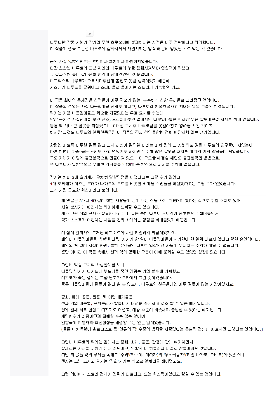 https://www.pgr21.net/pb/data/freedom/1585359552_1.png 제가 피지알에서 가장 인상깊게 읽었던 댓글입니다. 저는 나루토가 그런 만화였어야 했다고 생각하고 그럴 잠재력이 분명 있었다고 봅니다. 그냥 단순하게 선악 대결로 끌고갔어도 이야기가 산으로만 안 갔으면 좋았을 거다... 라는 생각은 저도 하긴 합니다. 근데 그랬어도 결국 그렇게까지 수준 높은 작품은 안 됐을 거예요. 저는 나루토가 깊이 면에서 진격거나 강연급 포텐셜이 있었다고 생각하거든요.
